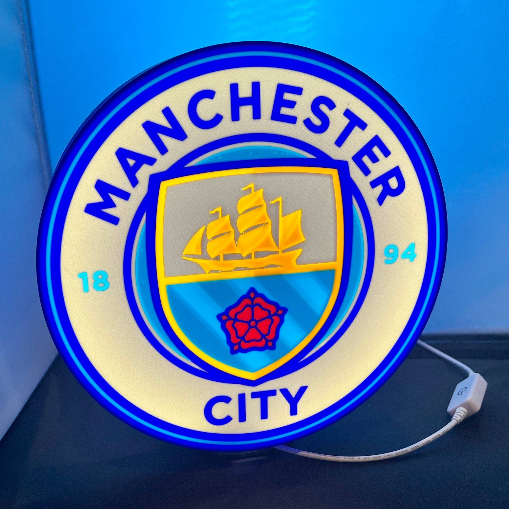 Manchester City FC - LED Lightbox Sign/Lamp - custom designed and ready to proudly display your fandom. Great for the game room, office, or mancave! The lightbox is 3D printed with LED's inside. Remote or switch available. Can hang onto the wall. Plugs into any 5V USB Changer.